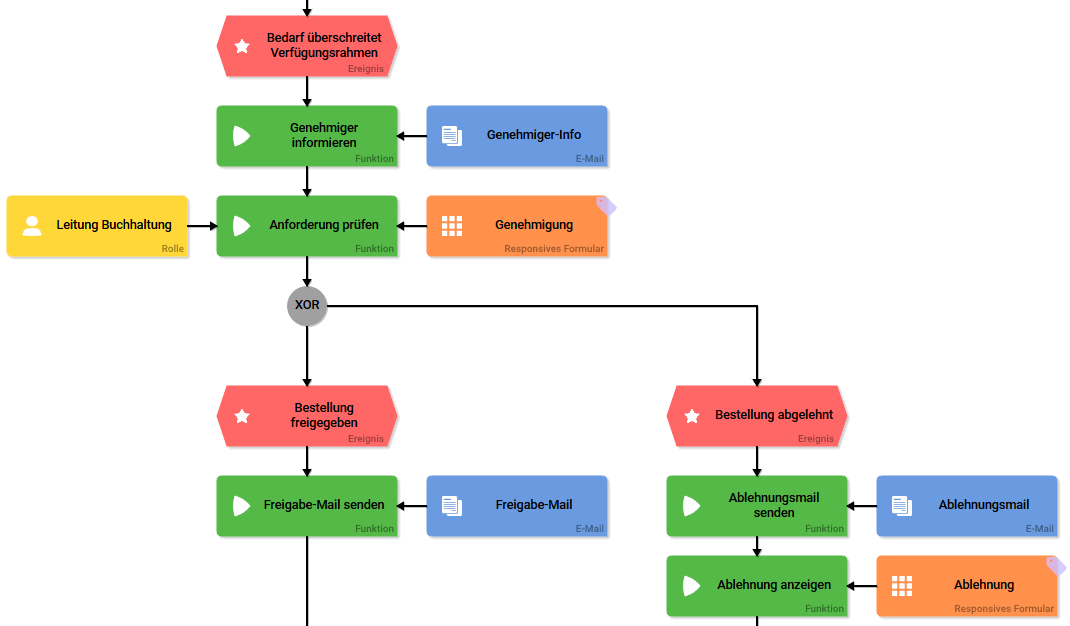 Ist der Wert des Feldes Gesamtpreis größer als 150, tritt das Ereignis Bedarf überschreitet Verfügungsrahmen ein und die Ausführung des Prozesses läuft in den Teilprozess Genehmigung.