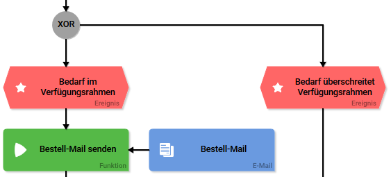 Nach dem XOR Konnektor findet in den Ereignissen die Bedingungsprüfung statt. Ist der Preis aus dem Beschaffungsantrag kleiner oder gleich 150, wird die Bestellung direkt akzeptiert und eine entsprechende Bestell-Mail gesendet. Anschließend läuft die Ausführung in den Teilprozess Bestellübermittlung.