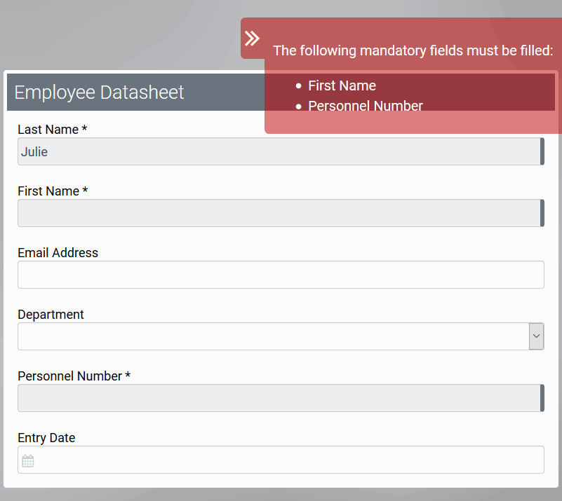 Specific information on the causes of errors and recommendations for action for the user are displayed directly in the form. These user notifications appear if it is not possible to switch to the next process step: