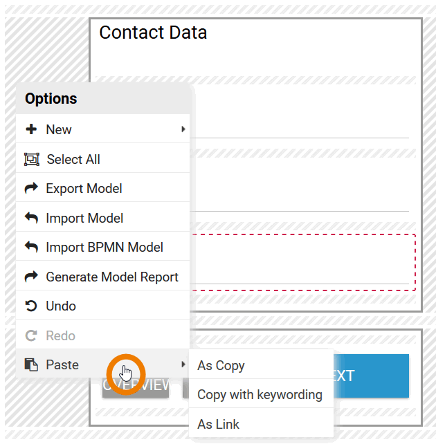 To Paste the element from the clipboard, open the context menu on an empty space of the work area.