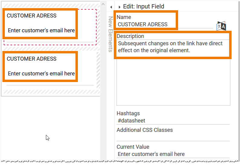 The option As Link is used if the same element is to occur at different places in the app. This applies equally to EPC and form elements. Classically, a form element used for master data input is linked to the overview where it is used as filter for the instance table. Subsequent changes to the name or other properties of the original element or one of the links immediately take effect in all other places where the element is used.