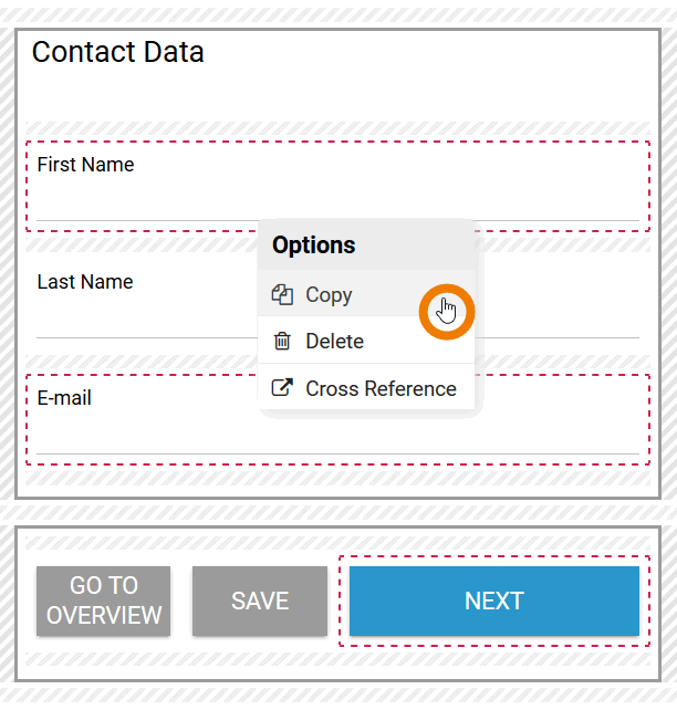 Use the context menu to copy and paste form elements. A right mouse click on the element opens the context menu and offers you the Copy option: