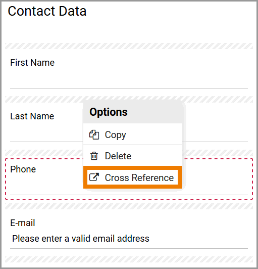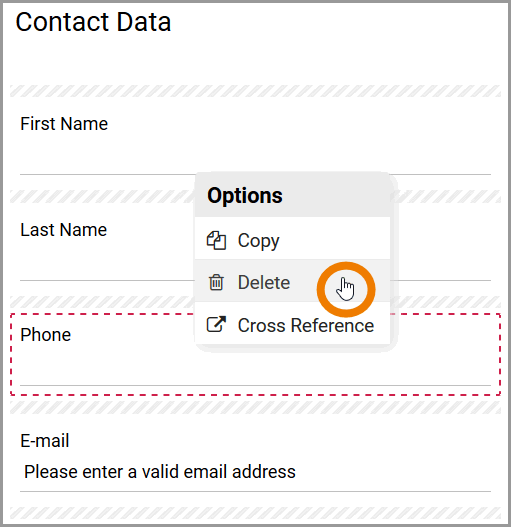 Previously created form elements can also be deleted. Open the context menu to do so. Open the context menu on a form element. One of the available options will be Delete: