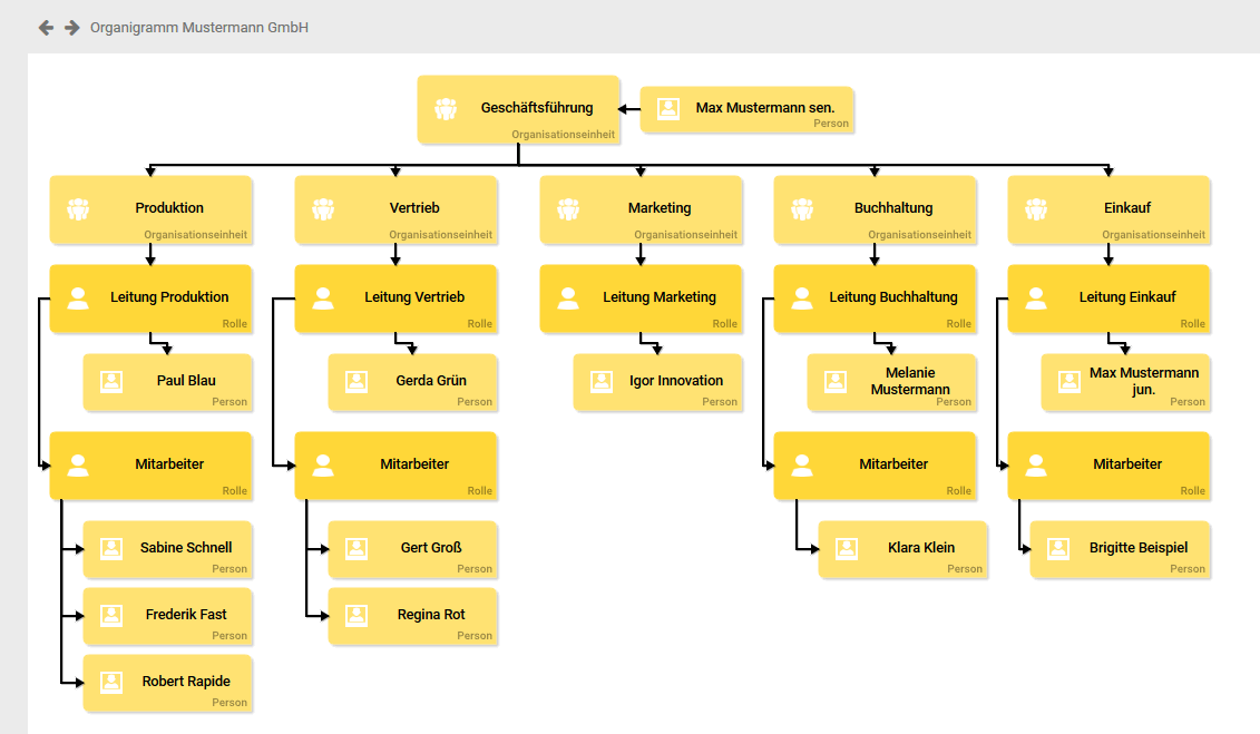Im Organigramm werden nicht nur die Abteilungen mit den zugehörigen Hierarchien abgebildet. Jeder Person wird auch bereits eine Rolle zugeordnet. Die Rollen werden später bei der Prozessmodellierung wiederverwendet.