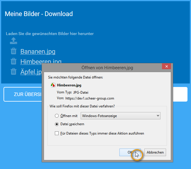 Die Links können für den Download der Dateien verwendet werden. Ein Klick auf Himbeeren.jpg öffnet ein entsprechendes Download-Fenster: