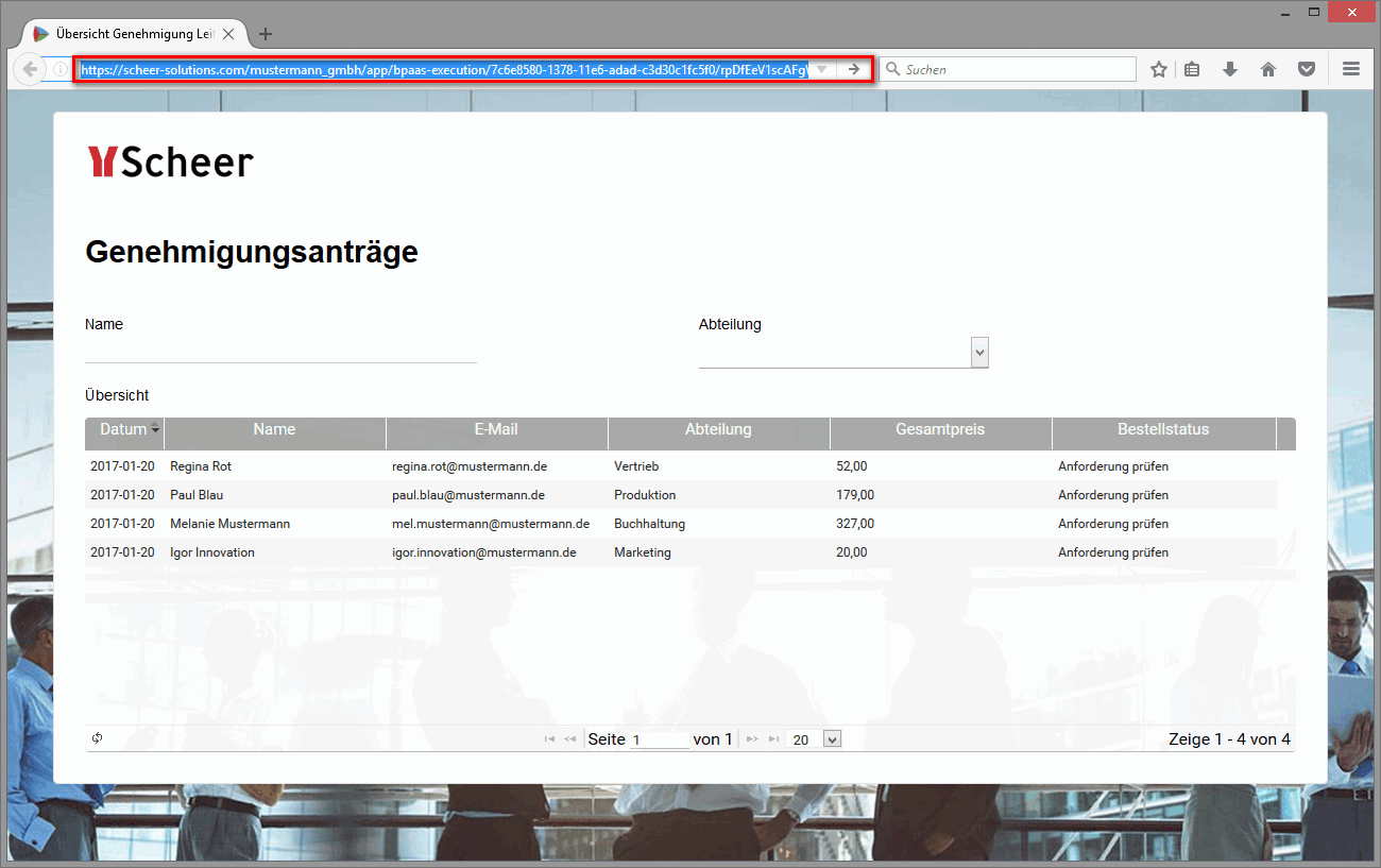 Er kopiert den Link der Übersicht aus der Adresszeile im Browser. Der Link enthält neben dem Namen des Mustermann-BPaaS-Systems auch die ID der geöffneten Übersicht: