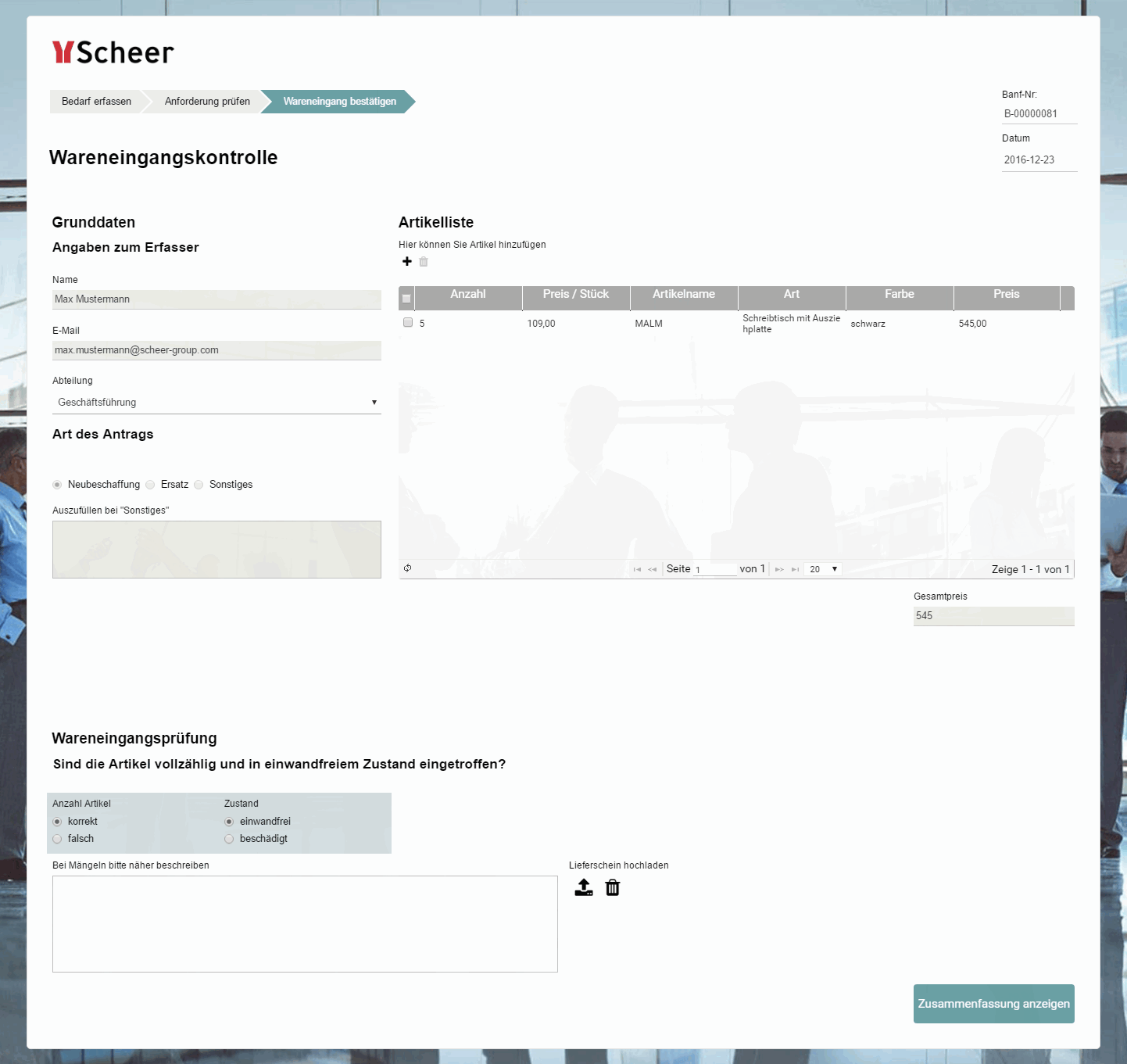 Im Beschaffungsprozess der Mustermann GmbH ist vorgesehen, dass die Leitung Buchhaltung einen Beschaffungsantrag genehmigen muss, wenn der Verfügungsrahmen überschritten wurde. Wird ein genehmigungspflichtiger Antrag neu angelegt, erhält die Leitung Buchhaltung automatisch die E-Mail Genehmiger-Info.