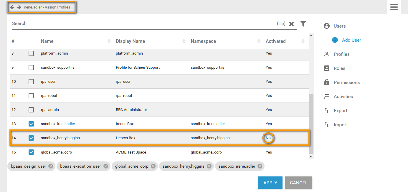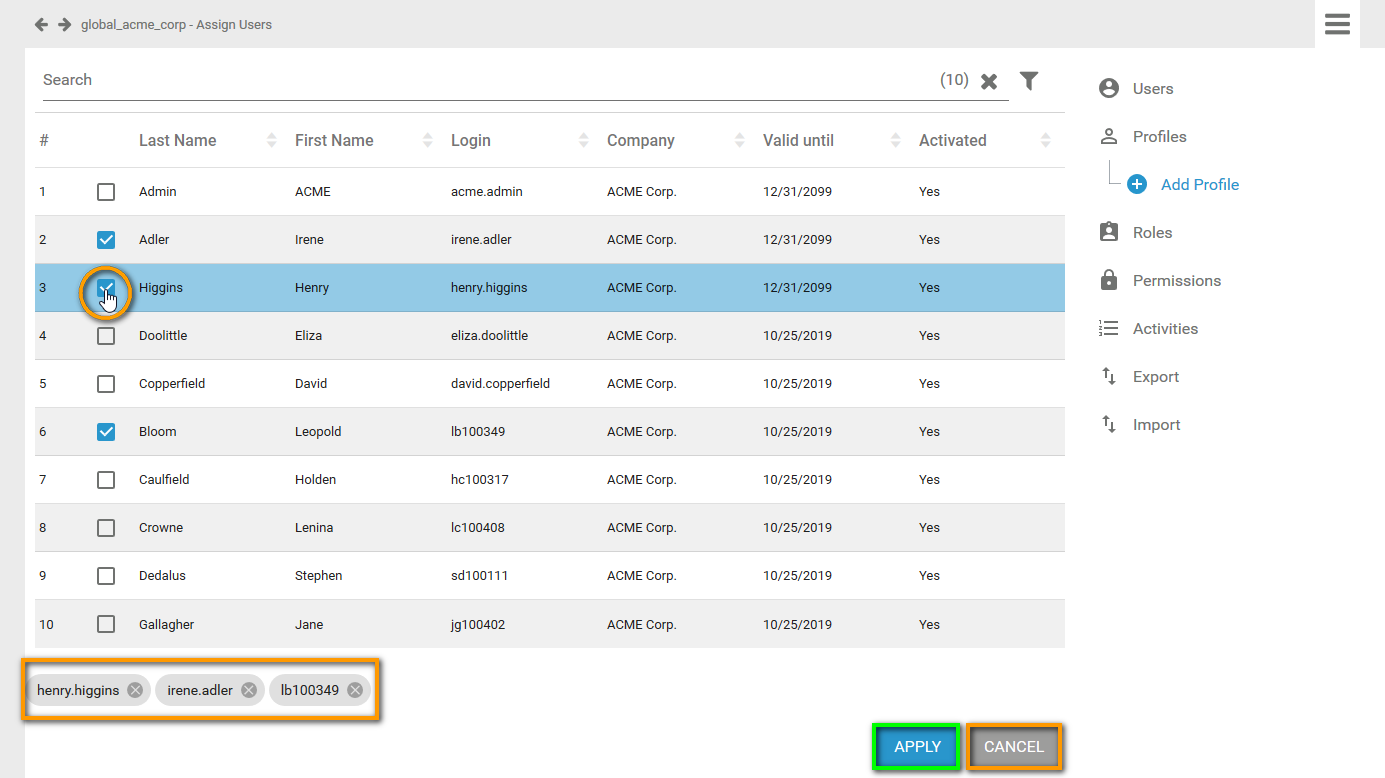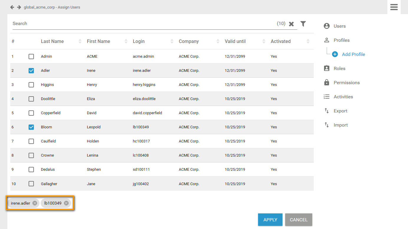Tick checkboxes to assign further users. Your choice will be added to the footer. Click Apply to assign the chosen users to the profile. Click the Cancel button to discard your choice: