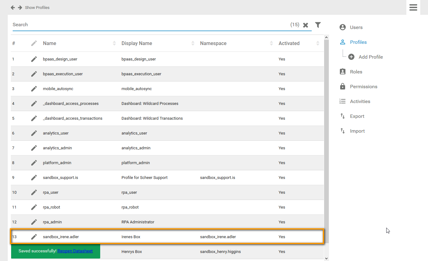 The profile data sheet closes and a message Saved successfully! is displayed. You can use the link from the success message to reopen the data sheet. In the content area the list of profiles is displayed and the modified profile shows the information No in column Activated: