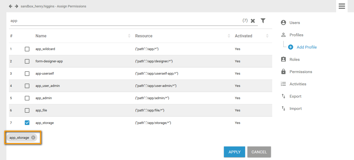 Tick checkboxes to assign further permissions. Your choice will be added to the footer. Click Apply to assign the chosen permissions to the profile. Click the Cancel button to discard your choice: