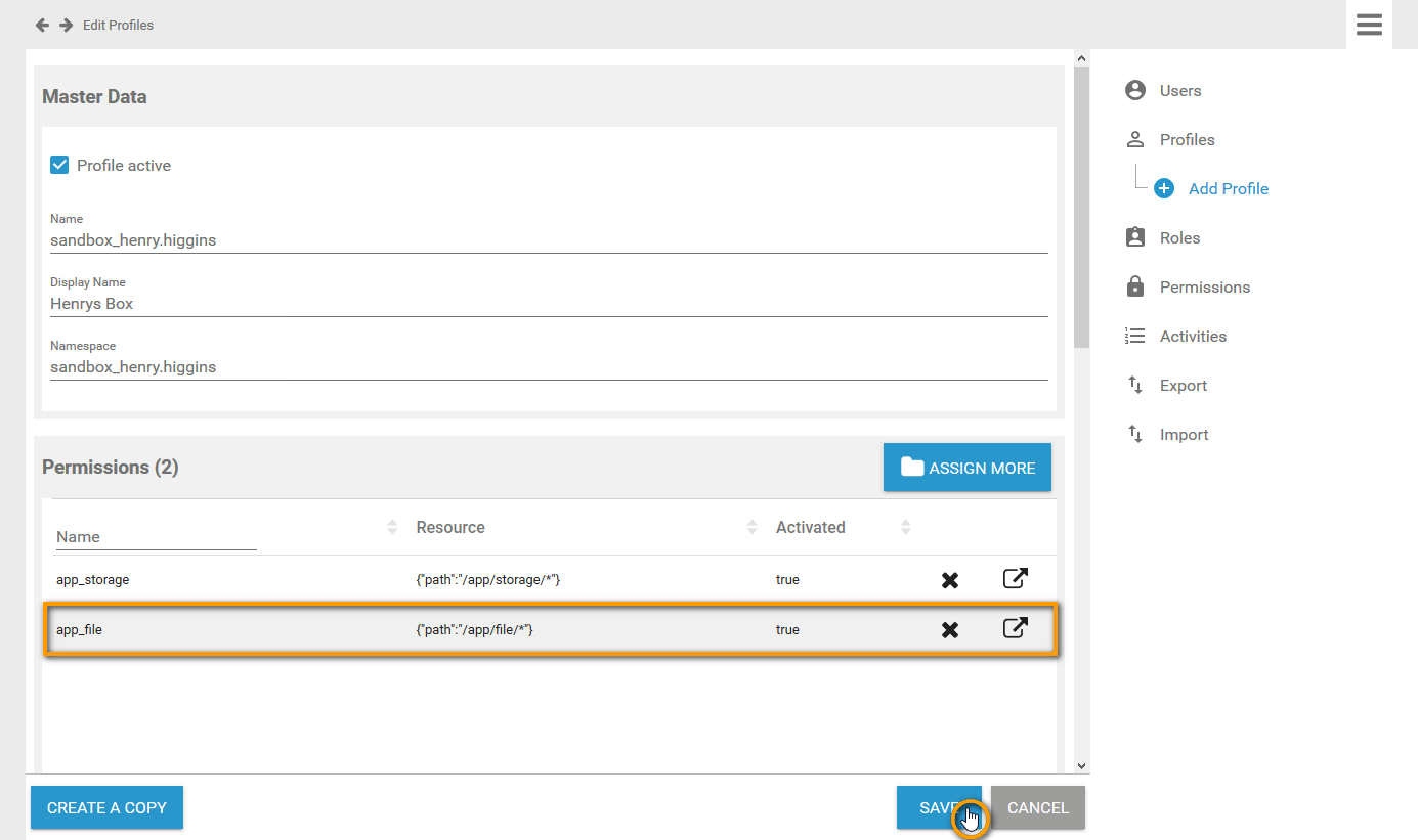 The chosen permissions are added to the permissions section of the profile data sheet. Click Save to apply the modifications. If you leave the data sheet by clicking Cancel, all modifications are discarded: