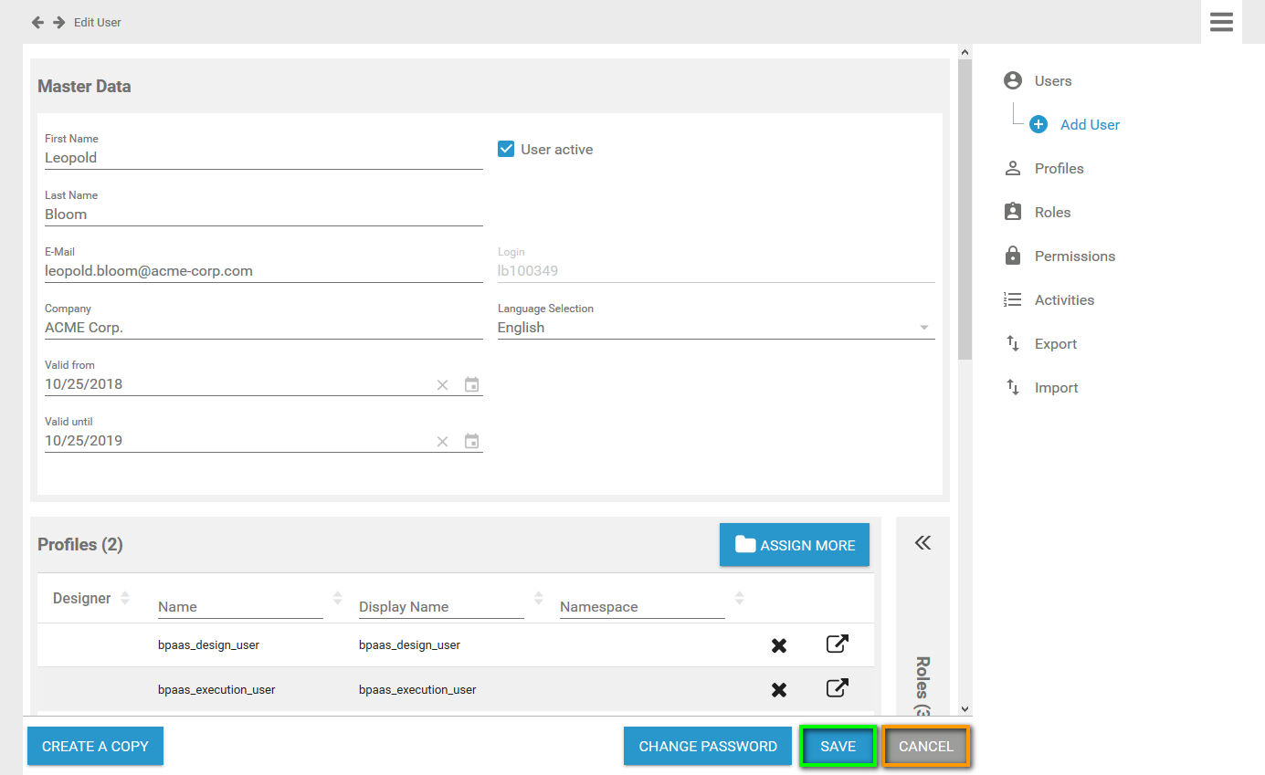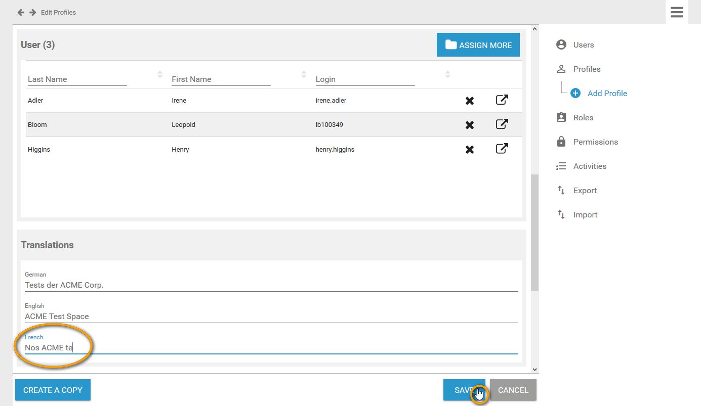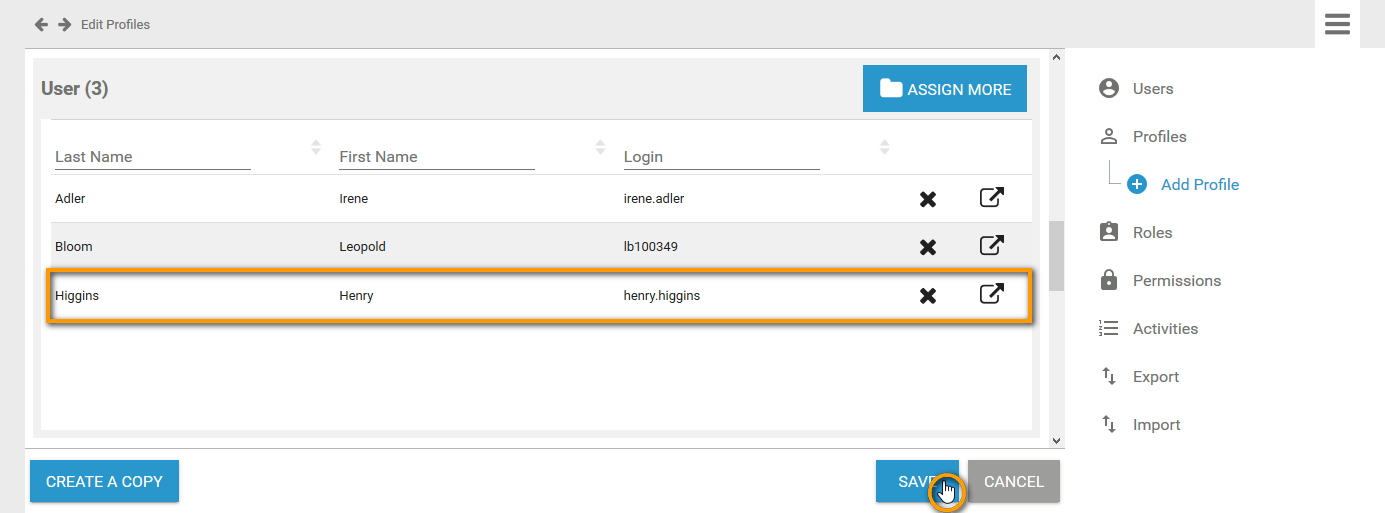 The chosen users are added to the User section of the profile data sheet. Click Save to apply the modifications. If you leave the data sheet by clicking Cancel, all modifications are discarded: