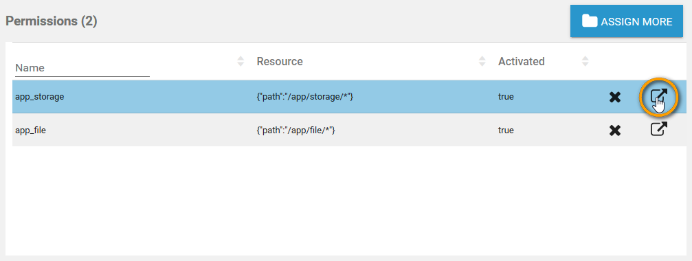 Administrators can also use the permissions section to switch directly to the corresponding data sheet to edit a permission. To do so, click the corresponding icon: