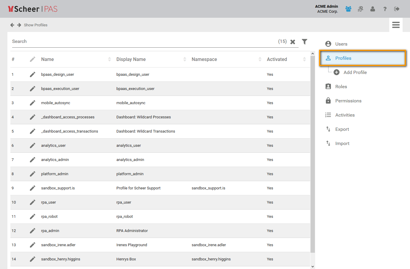 Display the list of profiles by selecting menu Profiles in the sidebar: