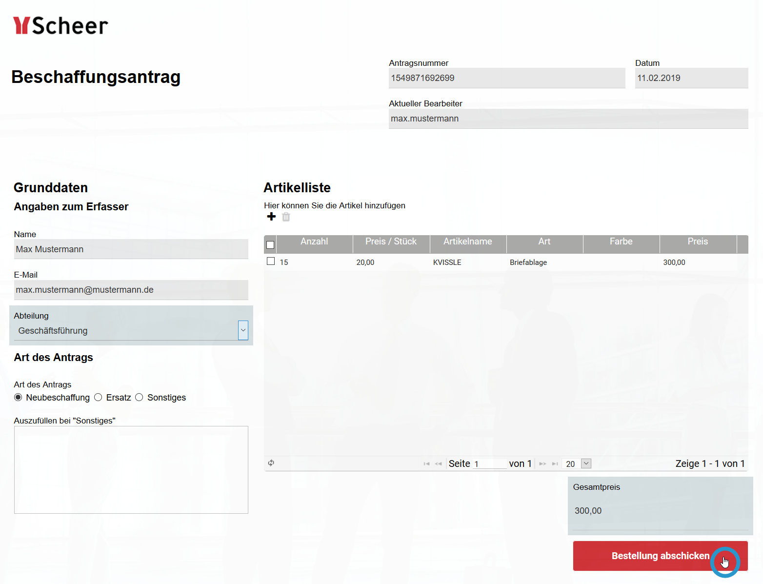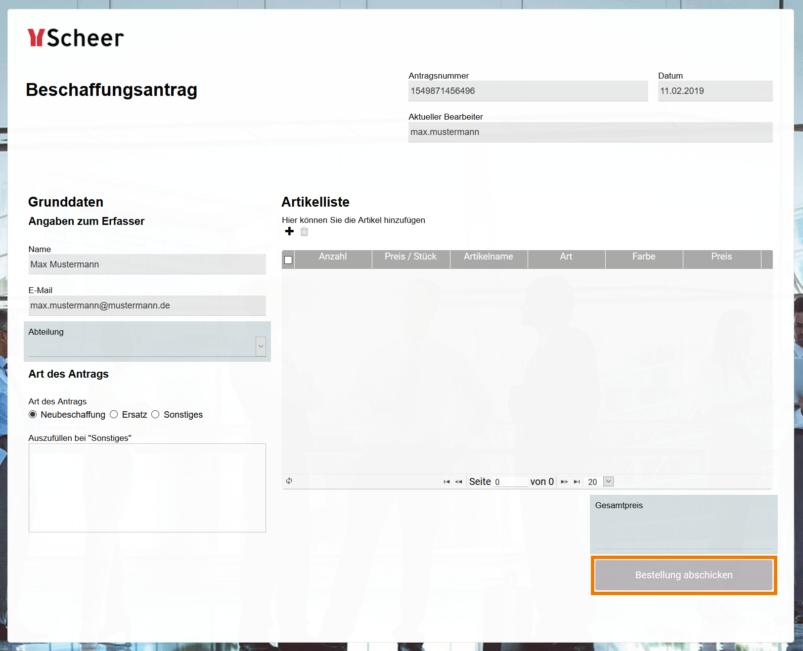 Im Anschluss testet er seine Eingaben: Er legt einen neuen Beschaffungsantrag an und speichert ihn über den Button Bestellung abschicken.
