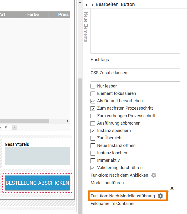 Max öffnet das Formular und markiert den Button Bestellung abschicken. Anschließend öffnet er den Editor der Funktion: Nach Modellausführung: