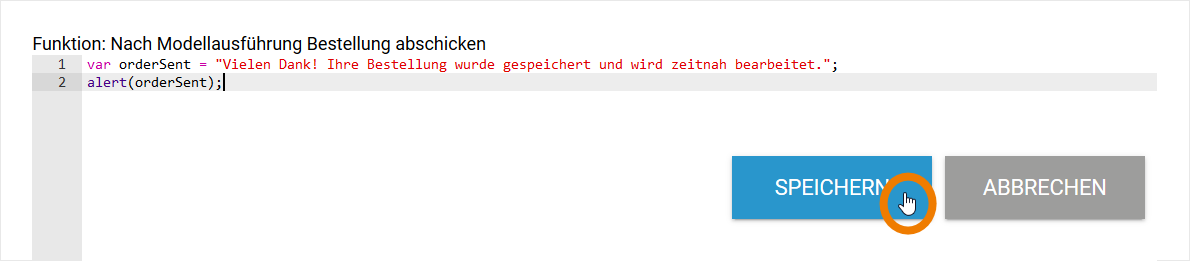 Hier speichert Max das Skript für seinen Alert. Er möchte, dass seinen Mitarbeitern der Text "Vielen Dank! Ihre Bestellung wurde gespeichert und wird zeitnah bearbeitet." angezeigt wird: