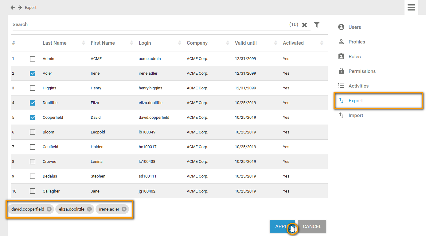 A list of available items opens, our example shows the user list. Use the checkboxes to choose the items you want to include in the export. The chosen items are displayed in the footer of the list: