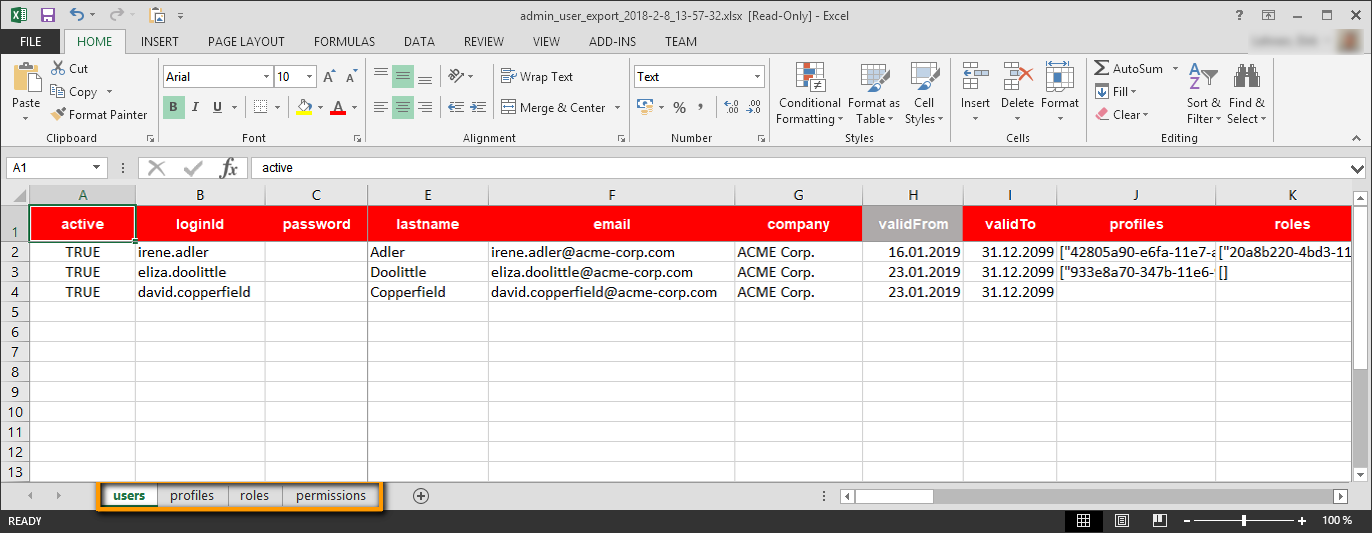 For data protection reasons, passwords are not exported with the data. If you want to use an export file to import users to another system, use the empty column password to assign new passwords.