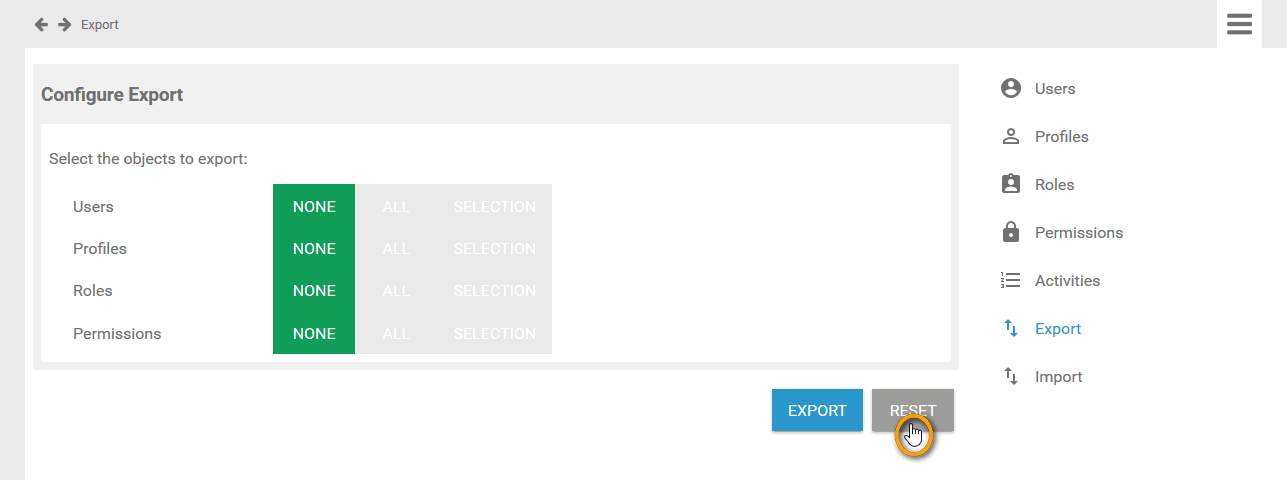 If you open menu Export, no objects are selected. The buttons of all four elements are set to position NONE:
