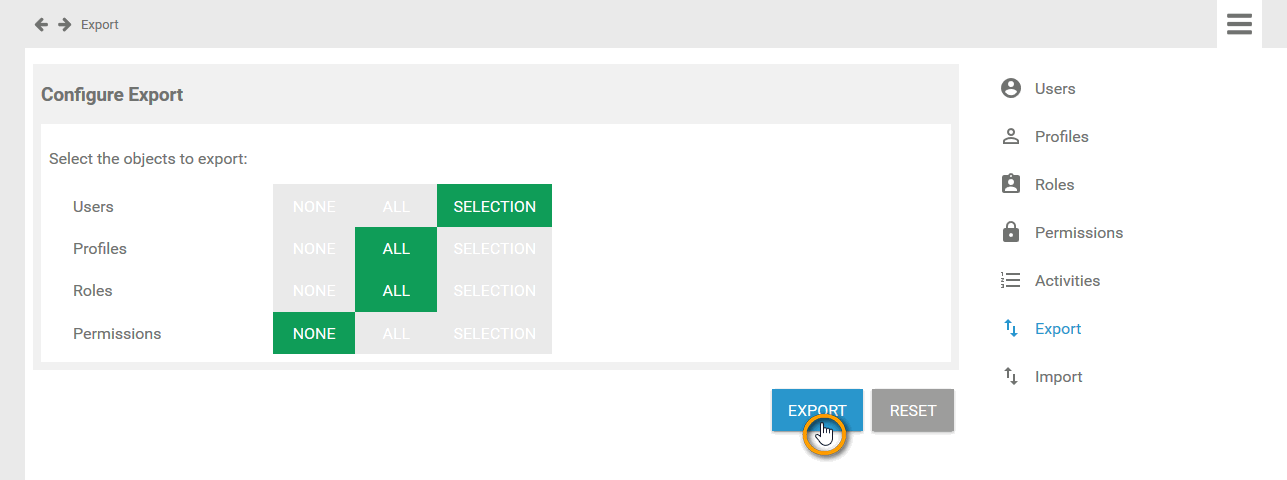 Administrators can configure the export according to their specific needs in window Configure Export. The following elements can be included in an export: