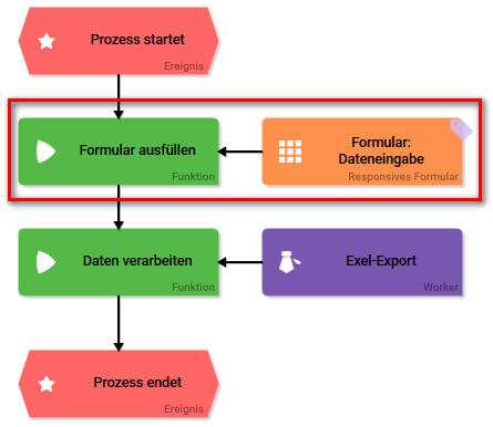 In einem zweiten Schritt werden benötigte Daten über ein Formular eingegeben. Über die Integration externer Datenquellen können auch Daten aus Fremdsystemen verwendet werden: