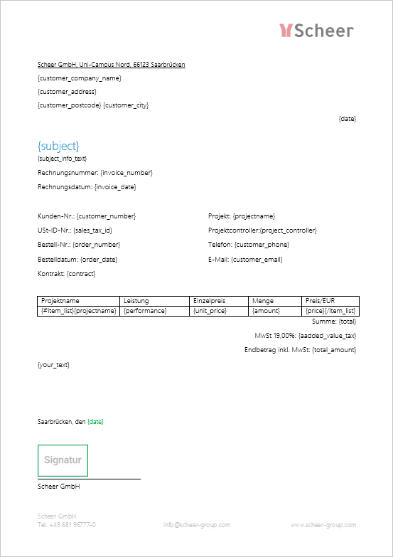Die Abbildung zeigt beispielhaft das Template für eine Rechnung: