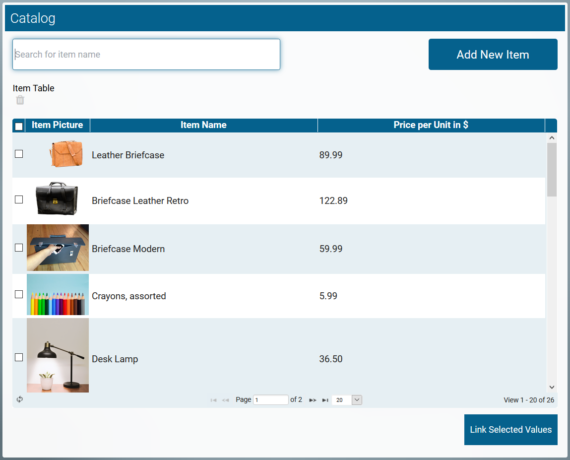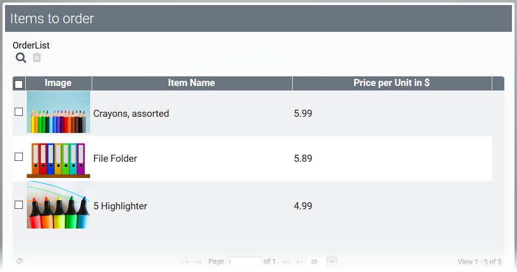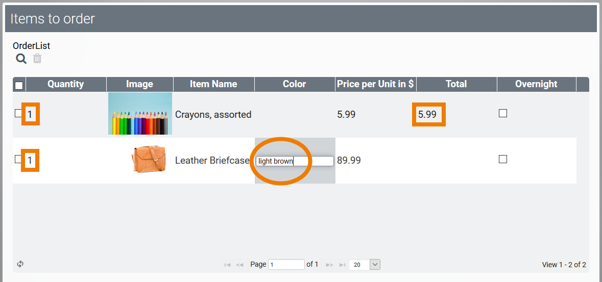 Employees can select items from the catalog which are transfered to the table of the app link OrderList:
