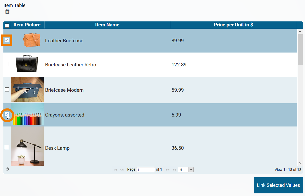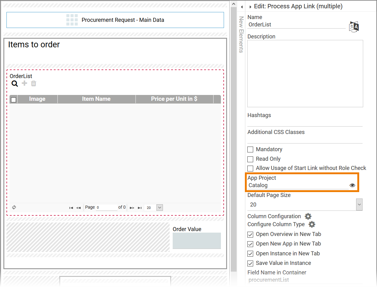 In ACME's Procurement Process, Irene Adler uses the Process App Link (multiple) OrderList to list ordered items. The app link refers to the app Catalog where the list of orderable items is managed: