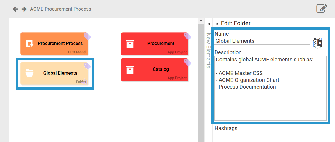 Example | In the profile of ACME Corp., some elements are used globally for every app, for example an ACME Master CSS file or the ACME Organization Chart. The Folder Global Elements contains links to all globally used elements which enables designers to access these elements quickly from any app: ![]() |