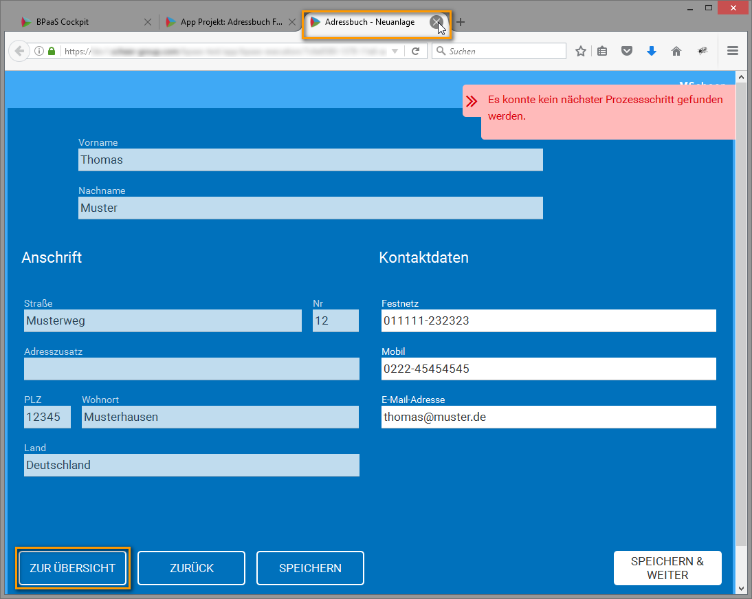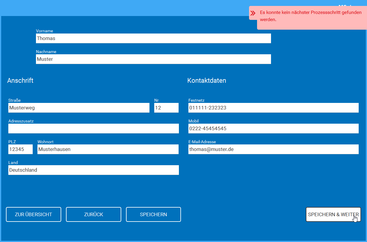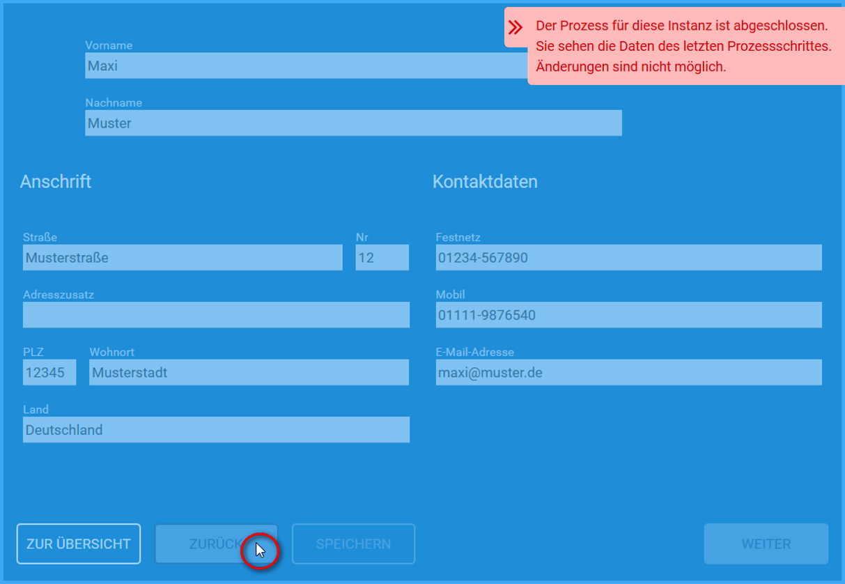 Die E-Mail wird im Hintergrund versendet. Damit hat der Anwender des Ende des Prozesses erreicht und der entsprechende Hinweis wird eingeblendet. Dem Anwender wird nach dem Klick auf den Button Speichern & Weiter das letzte Formular des Prozesses angezeigt. Die eingegeben Daten sind jetzt schreibgeschützt. Änderungen sind nicht mehr möglich: Die Schaltflächen Zurück, Speichern sowie Speichern & Weiter sind nicht mehr verwendbar: