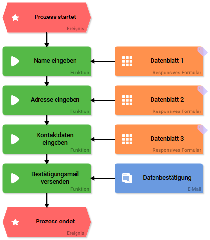 Das Ausfüllen von Datenblatt 3 ist für den Anwender der letzte sichtbare Prozessschritt. Nach dem Klick auf Speichern & Weiter wird der nächste Prozessschritt Bestätigungsmail versenden aufgerufen und der Versand der E-Mail Datenbestätigung angestoßen: