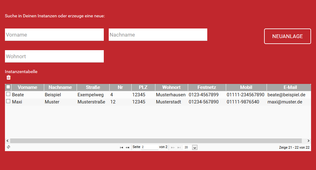 In der Suchübersicht erscheint der angelegte Datensatz: Die Daten wurden vor dem Abbruch des Prozesses wie gewünscht gespeichert. Öffnet man die Instanz, wird diese in dem Formular geöffnet, in dem die Daten vor dem Abbruch eingegeben wurden: