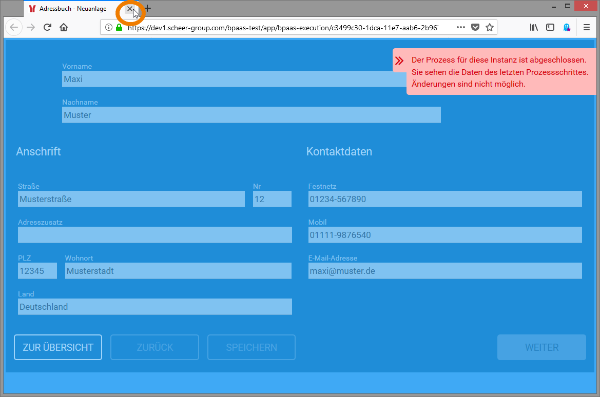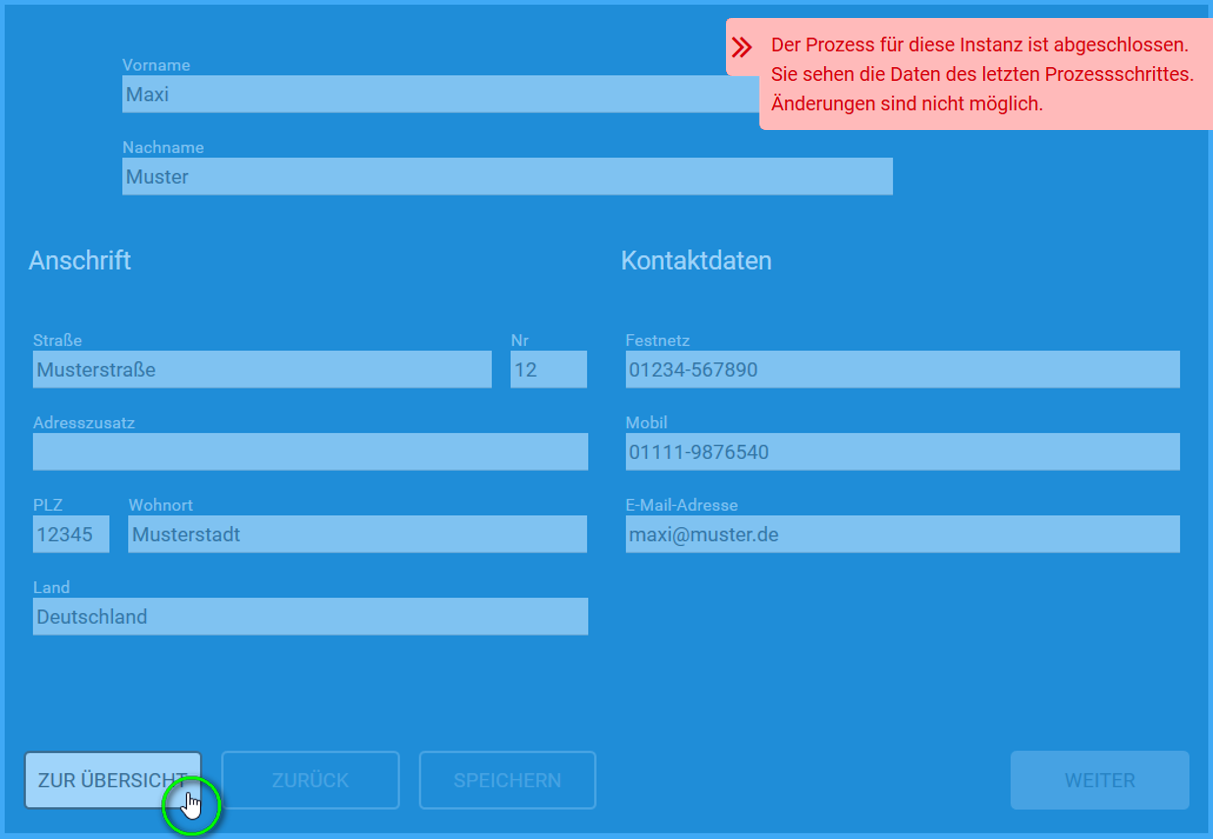Der Inhalt des letzten Formulars wird schreibgeschützt angezeigt: Die Daten können nicht mehr verändert werden. Auch die Schaltflächen funktionieren im letzten Prozessschritt nicht mehr - mit einer Ausnahme: Wurde ein Button Zur Übersicht eingefügt, kann man das letzte Formular über diesen Button verlassen und in die zugehörige Suchübersicht wechseln.