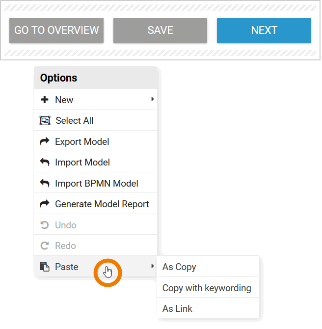 Switch to the form where you want to include the copied elements. Call up the context menu on the workspace and choose Paste.