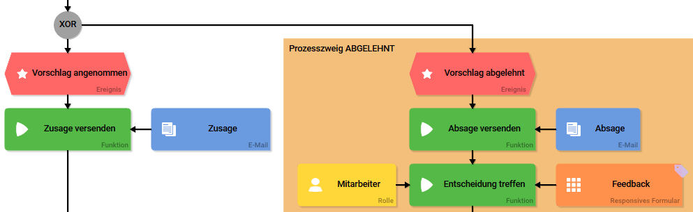Wird der Vorschlag abgelehnt, bekommt der Mitarbeiter das Feedback der Geschäftsleitung per E-Mail zugesendet. Er kann nun entscheiden, ob er seine Idee überarbeiten möchte oder nicht. Entscheidet er sich, den Vorschlag nicht zu überarbeiten, endet der Prozess an dieser Stelle.