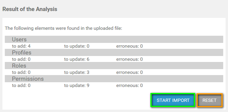 Please note, that elements such as users, profiles, roles and permissions created by an import cannot be assigned to other new elements created by the same import.