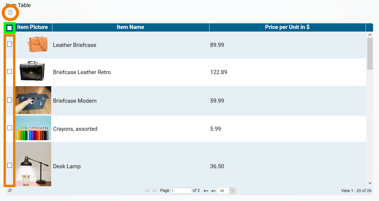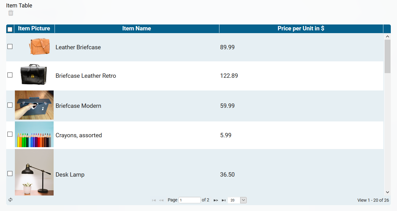 Example | The classic use case for an instance table is the table in an overview. The table displays all instances created in the corresponding app. The Item Table example shows the overview of a catalog app in which items are created that are available for order. The instance table contains the columns Item Picture, Item Name and Price per Unit in $: ![]() |