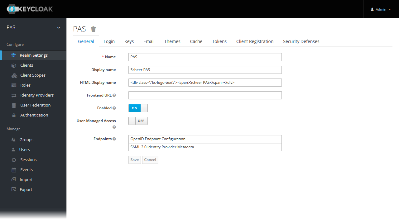 Scheer PAS uses Keycloak to save the platform users and their passwords. For API Management and Kibana we also manage roles in Keycloak. Keycloak is an identity and access management software that can manage users for multiple applications and enables them for single sign on. Data for each application is stored in so called realms: