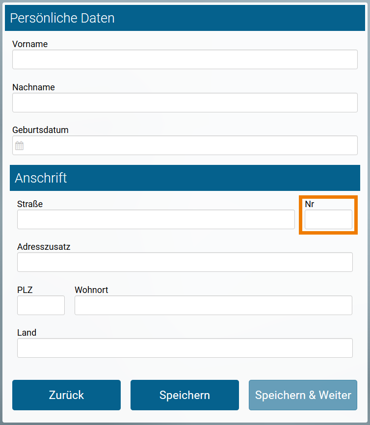 Im Formular Adresseingabe gibt es separate Formularfelder für Straße und Hausnummer (Nr). Das Hausnummernfeld wird jedoch gerne übersehen. Daher sollen die Eingaben nach dem Ausfüllen des Formulars geprüft werden: