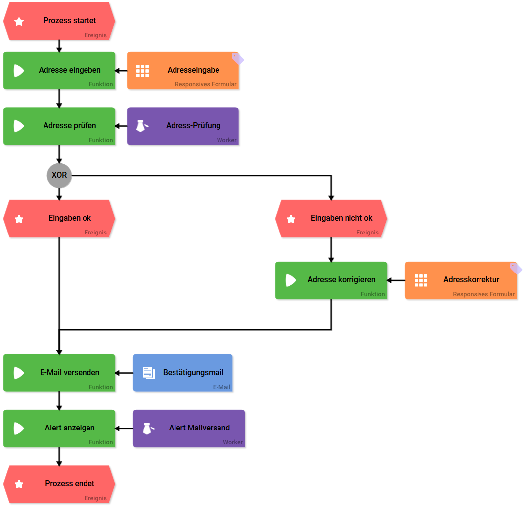 Im Formular Adresseingabe soll ein Anwender seine Adresse eintragen. Anschließend werden die Eingaben geprüft: Sind die Eingaben in Ordnung, wird eine Bestätigungsmail an den Anwender versendet. Entsprechen die Eingaben nicht den zugrunde liegenden Bedingungen, wird ein Korrekturversuch unternommen. Die korrigierten Daten werden dem Benutzer im Formular Adresskorrektur angezeigt. Der Anwender erhält im Anschluss eine Bestätigungsmail mit den korrigierten Daten. Über den Versand der Mail wird der Anwender durch einen abschließenden Alert informiert:
