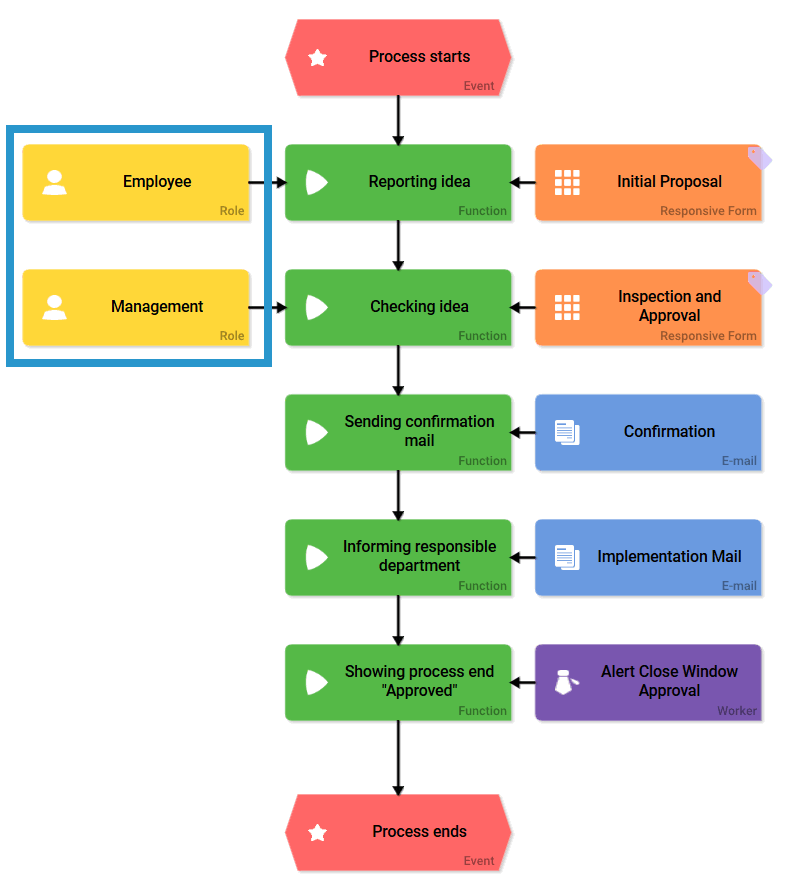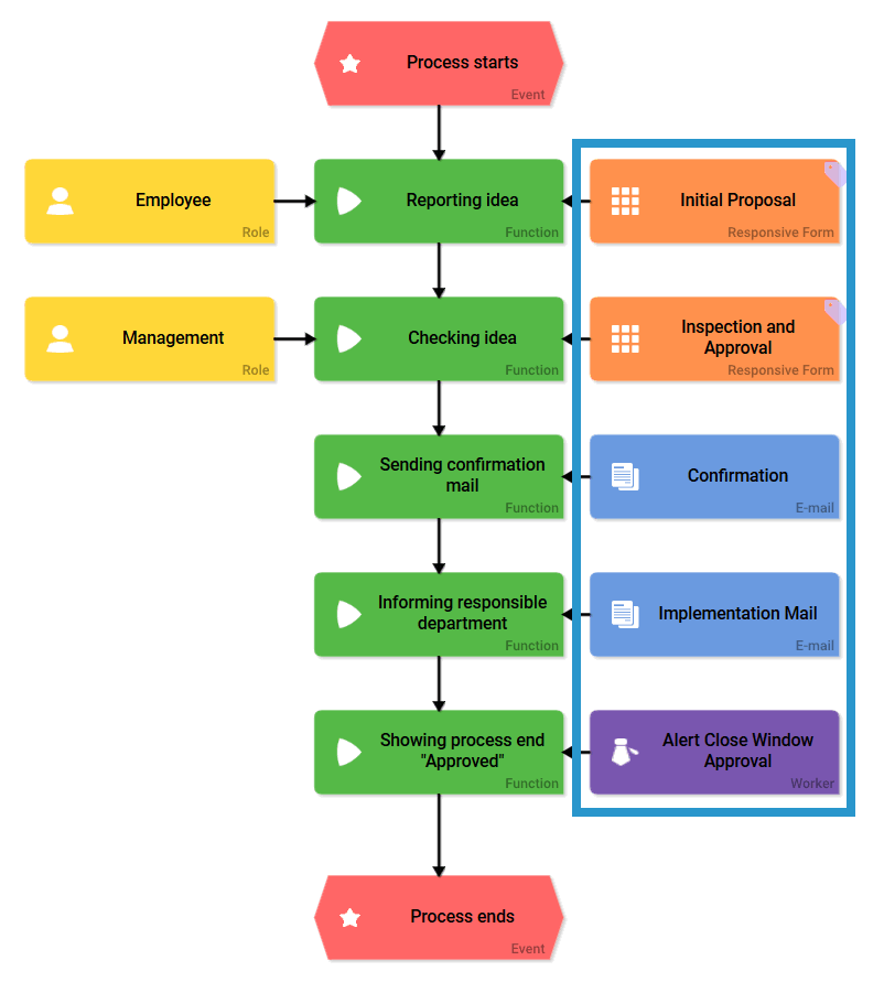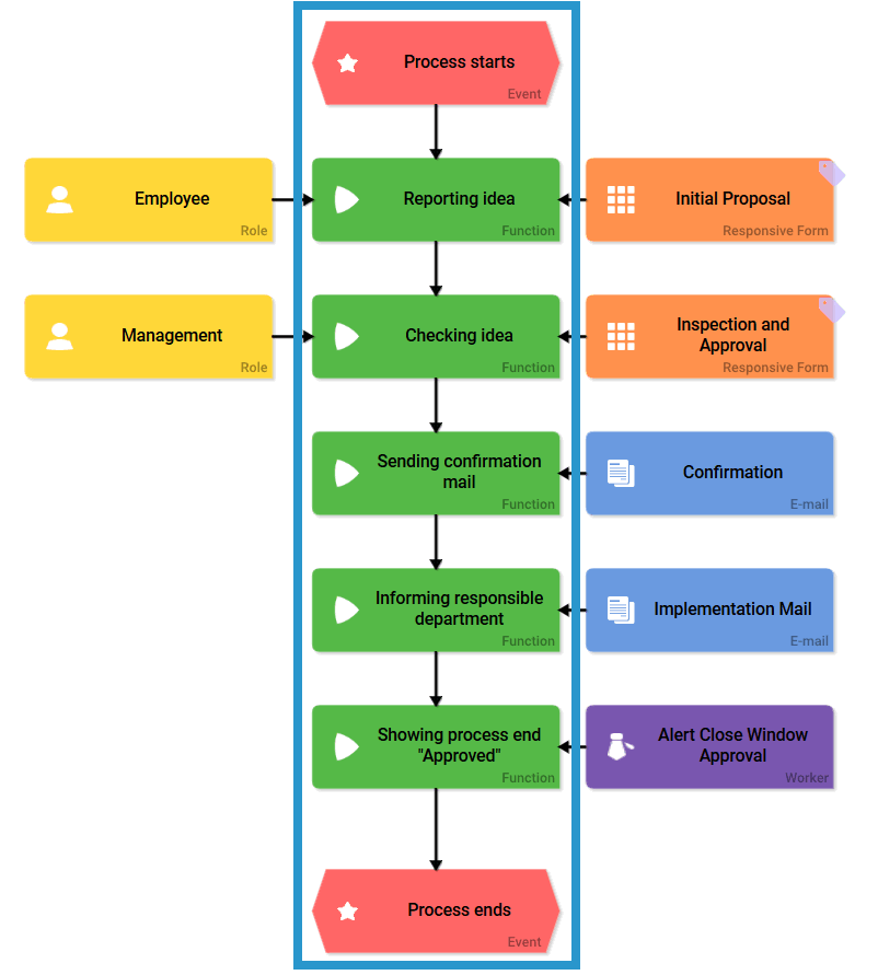 Elements that actively process information (Forms, E-Mails, Documents, Workers...) are positioned to the right of the main process: