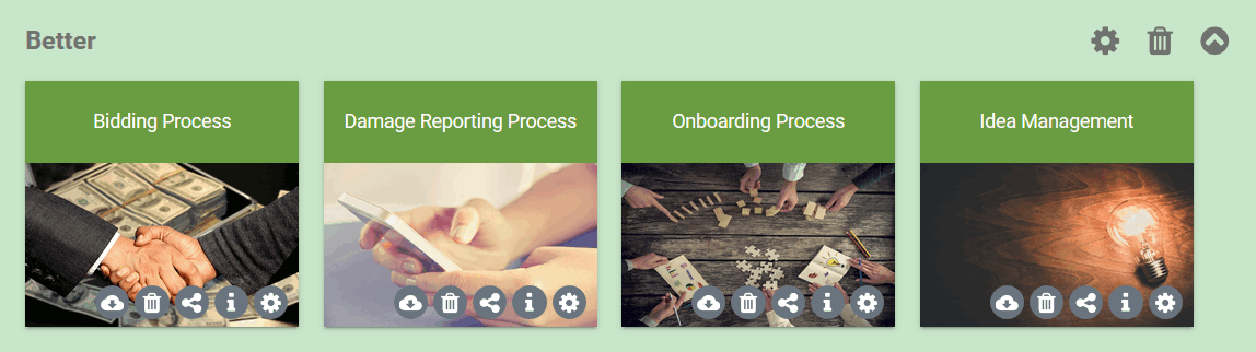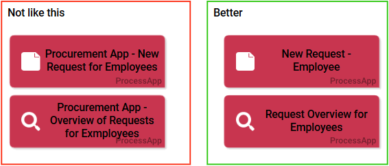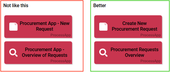 ![]() | The Process App start links Create and Overview shall receive names to describe that both Create and Overview belong together. Positive Examples: