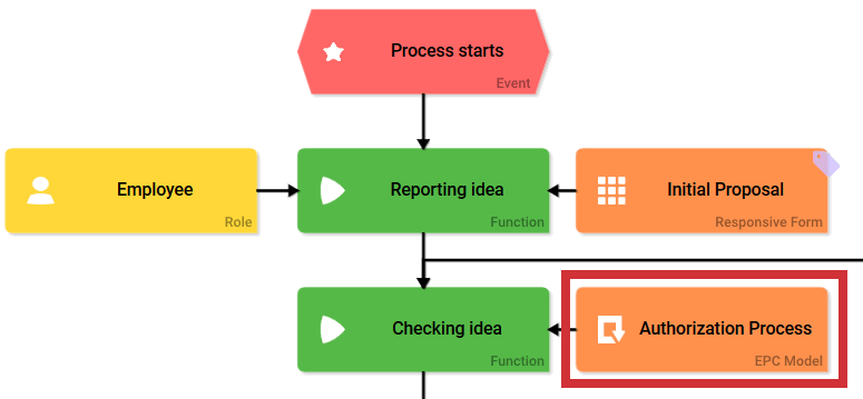 Once you open the EPC Model Authorization Process, you receive an overview of the entire subprocess: The new idea has to pass a technical, an economic and a staffing assessment. Afterwards management decides if implemention approval is granted. Only once this subprocess is finished the main process continues: