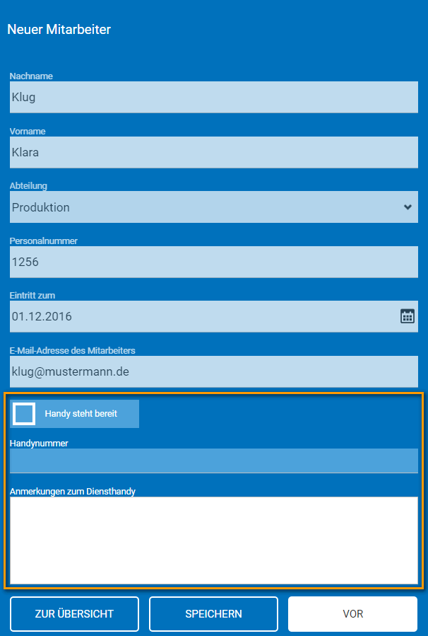 Ist die Konfiguration des Mobiltelefons abgeschlossen, wird im Formular Onboarding Handy die Telefonnummer eingetragen. Weitere Informationen zum Telefon können im Feld Anmerkungen zum Diensthandy festgehalten werden: