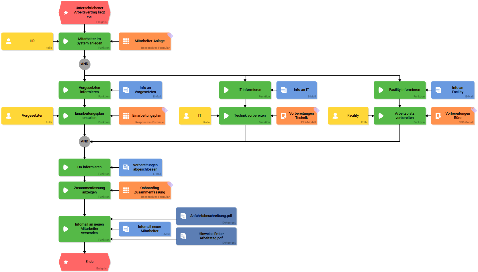 Sobald ein unterschriebener Arbeitsvertrag vorliegt, füllt ein HR-Mitarbeiter das Formular Mitarbeiter-Anlage aus. Die nächsten Prozessschritte finden in unterschiedlichen Fachabteilungen statt. Da die Fachabteilungen ihre jeweiligen Arbeitsaufgaben aber unabhängig voneinander erledigen können, startet nach der Mitarbeiter-Anlage eine parallele Ausführung (im EPK-Modell als AND-Verzweigung modelliert):