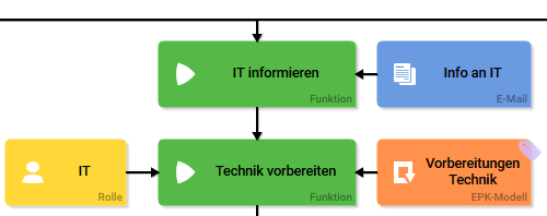 Die IT-Abteilung erhält ebenfalls per Mail die Information, dass technische Vorbereitungen für das Onboarding eines neuen Mitarbeiters zu treffen sind. Da die IT mehrere Arbeitsschritte zu bewältigen hat, wurden diese in der Unter-EPK Vorbereitungen Technik modelliert:
