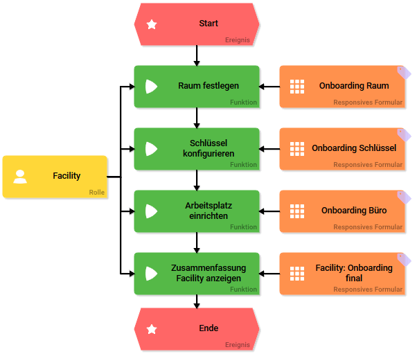 Das Facility-Management hat die Aufgabe, die Büroräumlichkeiten für den neuen Mitarbeiter einzurichten: Ihm wird ein Büro zugeteilt, das eingerichtet werden muss. Außerdem erhält der neue Kollege einen Schlüssel für das Bürogebäude, der für die entsprechenden Etagen freizuschalten ist.