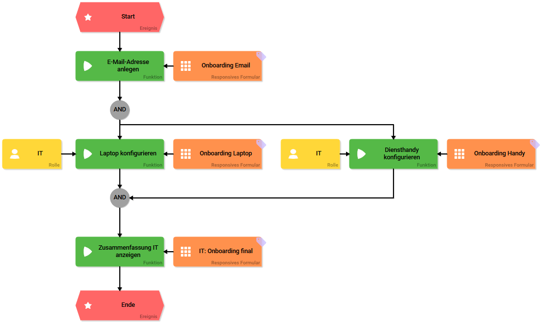 Der Unterprozess Vorbereitungen Technik startet mit der Anlage einer E-Mail-Adresse für den neuen Mitarbeiter. Anschließend müssen Laptop und Diensthandy des neuen Mitarbeiters konfiguriert werden. Da diese beiden Schritte parallel ausgeführt werden können, wird hier ebenfalls eine AND-Verzweigung eingesetzt. Erst wenn beide Schritte ausgeführt wurden, läuft der Prozess weiter in den abschließenden Schritt Zusammenfassung IT anzeigen.