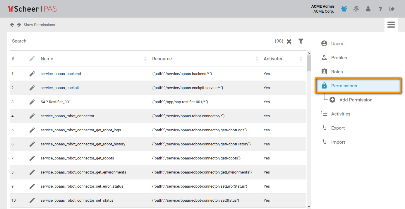 Permission active: The checkbox indicates, if the permission has been activated. Default is active.